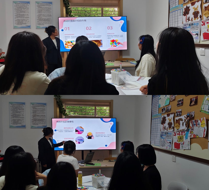 活动伊始,赵娅囡老师通过PPT生动讲解“情绪编织”这一艺术表达疗法。从阐述情绪外化的重要性,到剖析活动对情绪疗愈的作用,如提供情感宣泄渠道、增强自我效能感、促进社交互动等,再到指导“剪碎情绪阶段”等具体操作,深入浅出的讲解让同学们全神贯注。