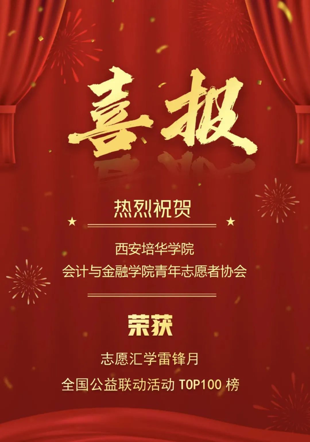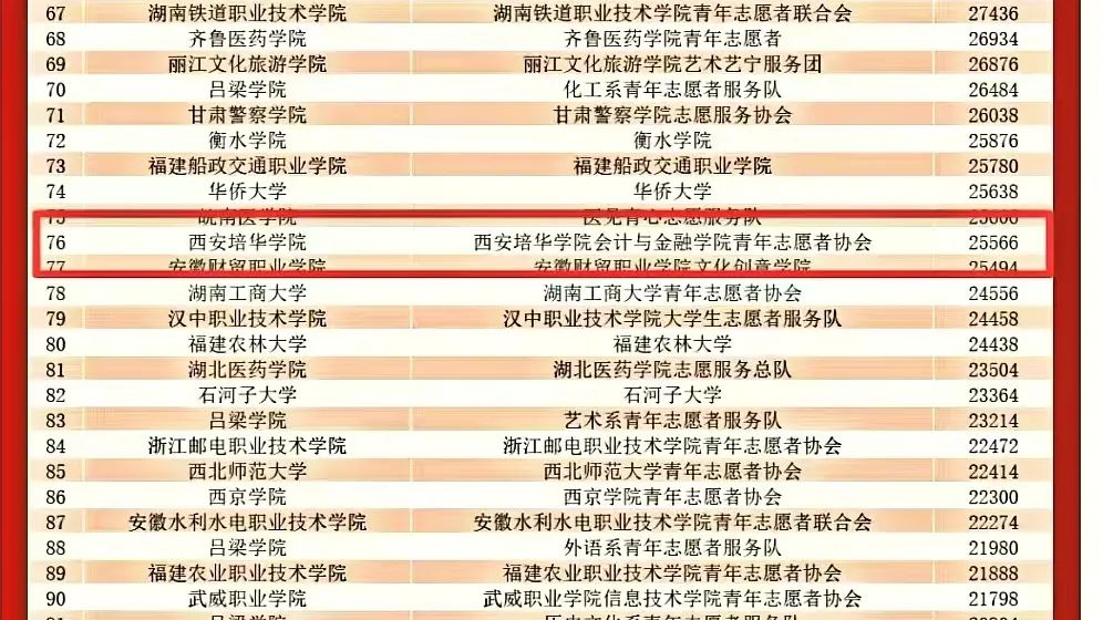 热烈祝贺西安培华学院会计与金融学院青年志愿者协会在“志愿汇”学雷锋月全国公益联动活动荣获TOP100榜!