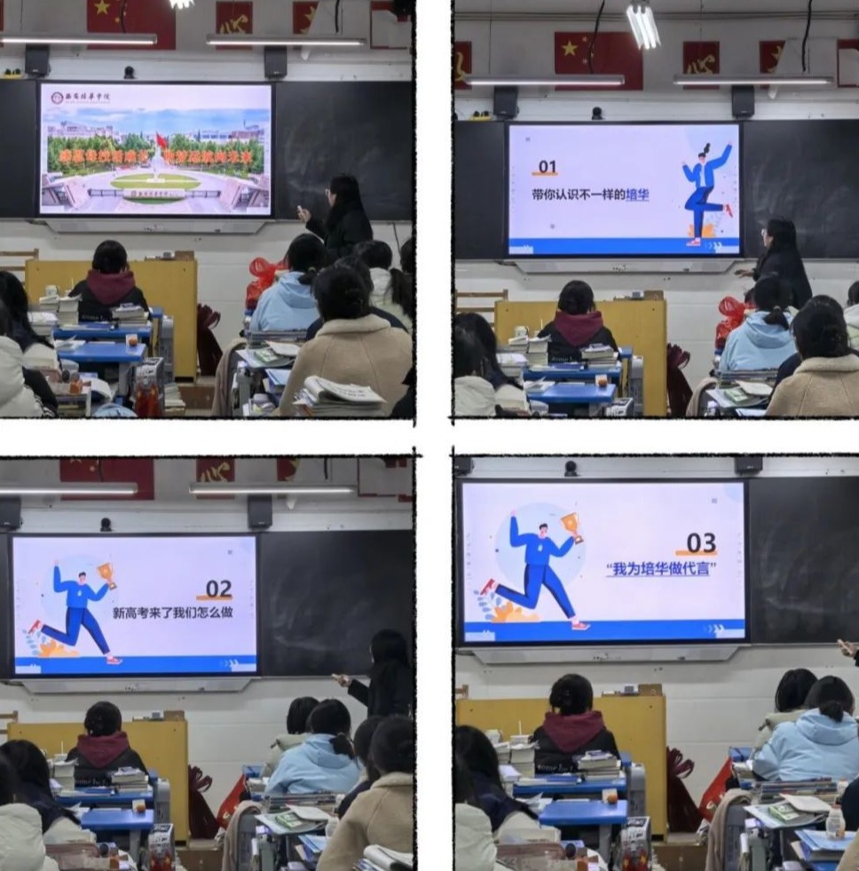 队长刘明杰以“感恩母校话成长,助梦远航向未来”为主题的PPT开场。内容涵盖“领略别样培华”“新高考应对策略”“我为培华做代言”三大板块,PPT与视频联动,尽显培华独特风姿。