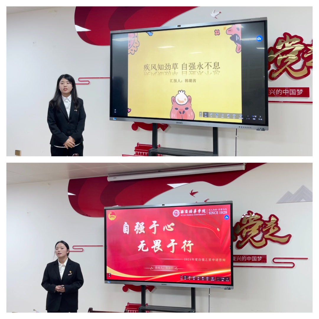本次答辩全程把控答辩时间,纪律严明。严格按照规定流程进行,参与的学生在指定时间内,结合PPT和相关材料,向评委们展示自己的获奖情况、学习方面、实践方面、生活方面等荣誉。