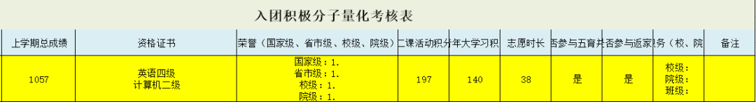 辅导员在各班进行发展团员宣讲后,各班意向竞选发展团员的同学进行班级答辩,确定名额后上报给团委,团委工作人员对所有人进行量化考核,考核基本内容如下表: