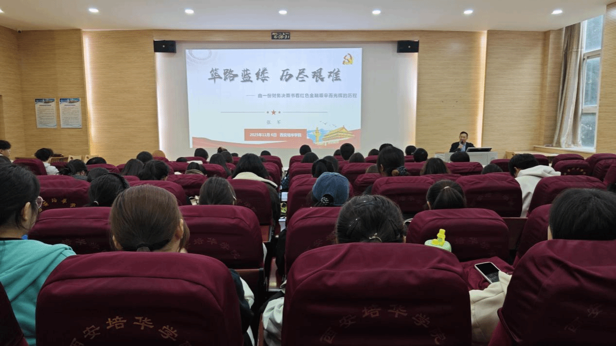 为赓续红色血脉,传承金融精神,2025年11月6日星期四16:00,在博远楼J202阶梯教室,会计与金融学院特邀中国人民银行陕西省分行原副行长、重庆市分行原副行长,现任中国金融会计学会常务理事、陕西省金融会计学会会长张军,为百余名师生带来了一场题为《由一份财务决算书看红色金融艰辛而光辉的历史》的专题讲座。本次讲座将厚重的金融史与鲜活的思政教育深度融合,为在场师生进行了一次深刻的思想洗礼与专业启迪。会计与金融学院院长吴旺延,学院数名骨干教师及优秀学子共同参加,讲座由西安培华学院金融文化研究院院长赵晓舟主持。