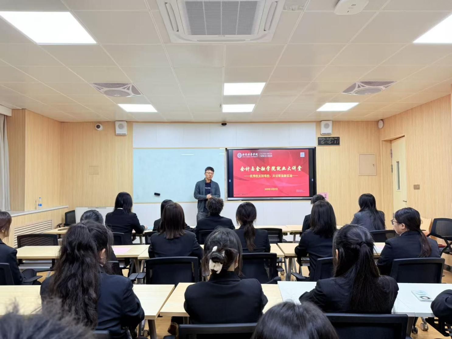 赵江波学长结合自身在校担任学生干部及校园实践经历,从个人就业与创业轨迹讲起,剖析了“专业能力、软技能、职业韧性”三位一体的职业发展模型。他特别提醒学生:“在AI快速冲击财务领域的当下,数字化工具应用能力与业务洞察力将成为核心护城河。”他还告诫学弟学妹,要破除思维局限,打开求职眼界,紧跟时代潮流,主动学习新思想新技术,敢于尝试积极参与,了解各行各业的发展趋势,提高认知水平帮助找准事业发展方向。