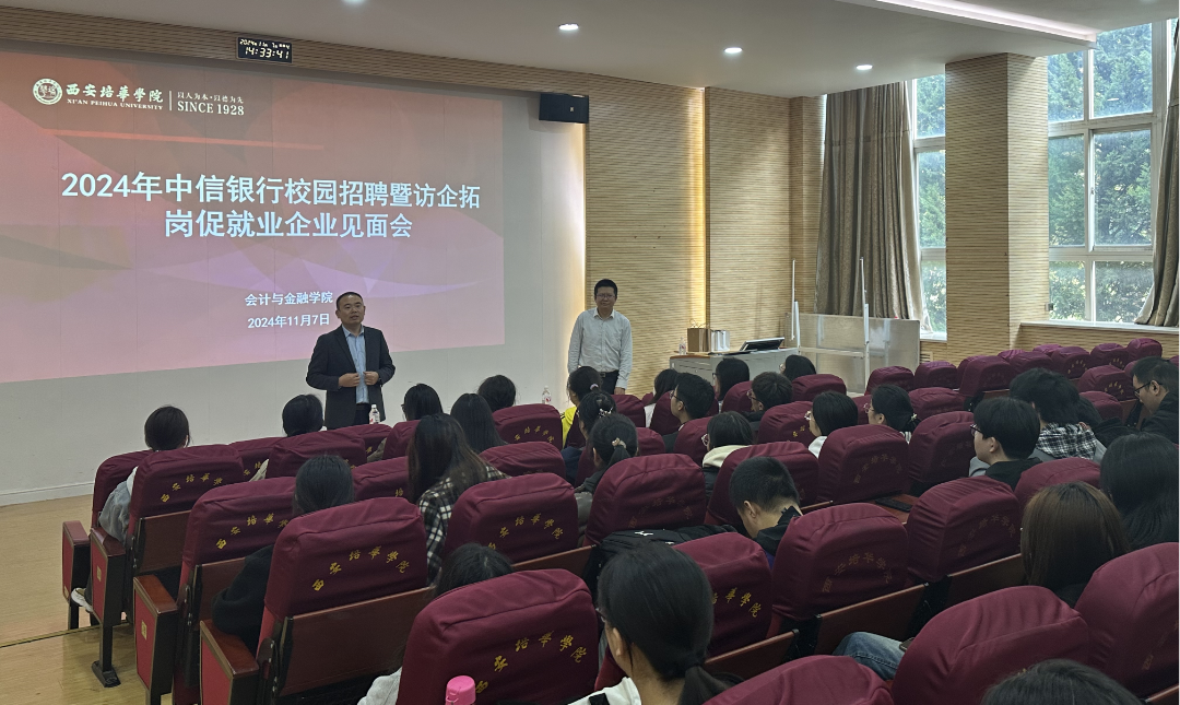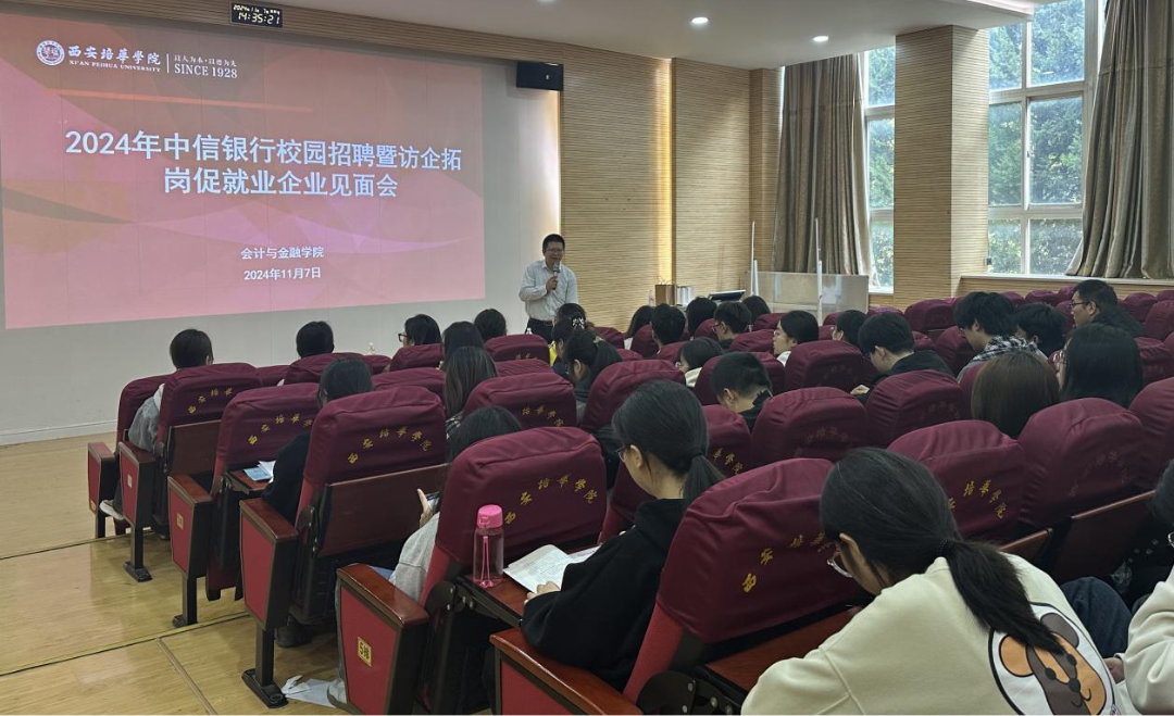 为进一步落实国家“促就业 稳就业”指导方针,稳固搭建大学生求职就业平台,2024年11月7日在博远楼J201 教室举办中信银行企业宣讲会。此次活动参加的领导有中信银行行长尹总、会计与金融学院党委书记刘斌以及毕业班辅导员。