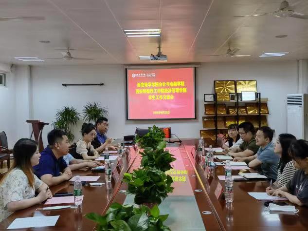 为了提高学校学生工作管理与服务水平,加强两校学院学生工作经验交流,学习兄弟学校优秀经验和做法,促进教育教学和学生管理工作的不断提升。6月13日15:00,西安明德理工学院经济与管理学院领导来到西安培华学院会计与金融学院开展学习交流。参加本次交流会的嘉宾有:西安明德理工学院经济与管理学院党委书记兼行政副院长何文举,经济与管理学院党委副书记冯纪潮,经济与管理学院团委书记耿露,经济与管理学院学生党支部书记胡梦妮,经济与管理学院学生工作年级组长白丽萍。西安培华学院会计与金融学院党委书记兼行政副院长史立军,西安培华学院会计与金融学院党委副书记韩斌,会计与金融学院党务行政干事朱梦阳,会计与金融学院团委书记寇方译,会计与金融学院学生干事王迪,座谈会由王迪老师进行主持。
