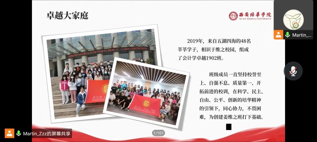 为了更好的开展“姜维之班”创建工作,结合《西安培华学院关于疫情期间“姜维之班”创建工作的若干措施》的文件精神,按照会计与金融学院的实际情况,经学院创建领导小组讨论决定成立会计与金融学院“维之精神宣讲队”。旨在结合疫情防控需求,经过线上宣讲,继续巩固学院“姜维之班”创建成果,更好的在创建班级的学生中传播维之精神,发挥好创建“姜维之班”的引领示范作用,共同打赢防控狙击战。