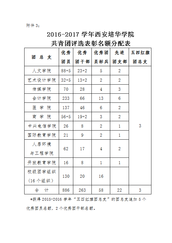 附件3:2016-2017学年西安培华学院共青团评选表彰名额分配表