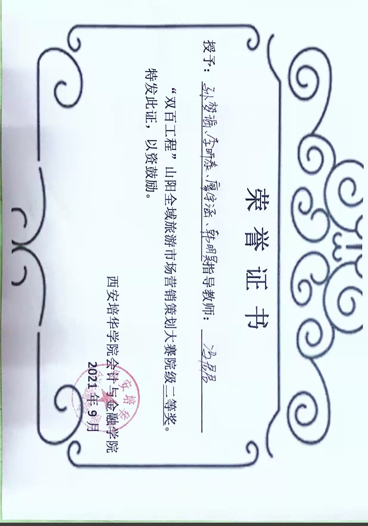 2021年9月,荣获“双百工程”山阳杯旅游策划大赛二等奖2020年12月,荣获第八届“博导前程杯”电子商务运营能竞赛省级“三等奖”