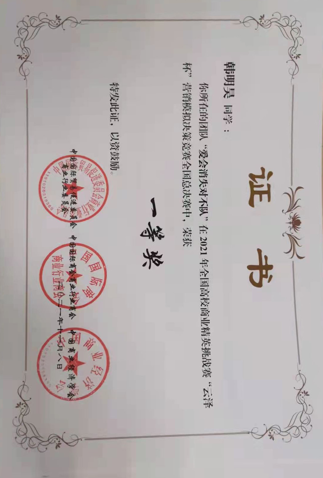 2021年11月荣获“云泽杯”营销模拟决策竞赛全国总决赛“一等奖”
