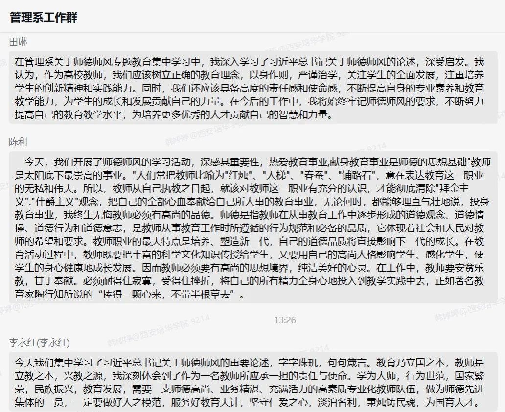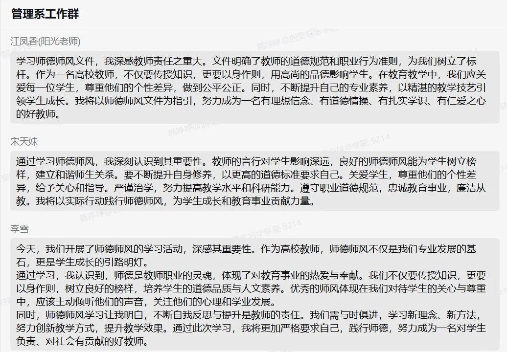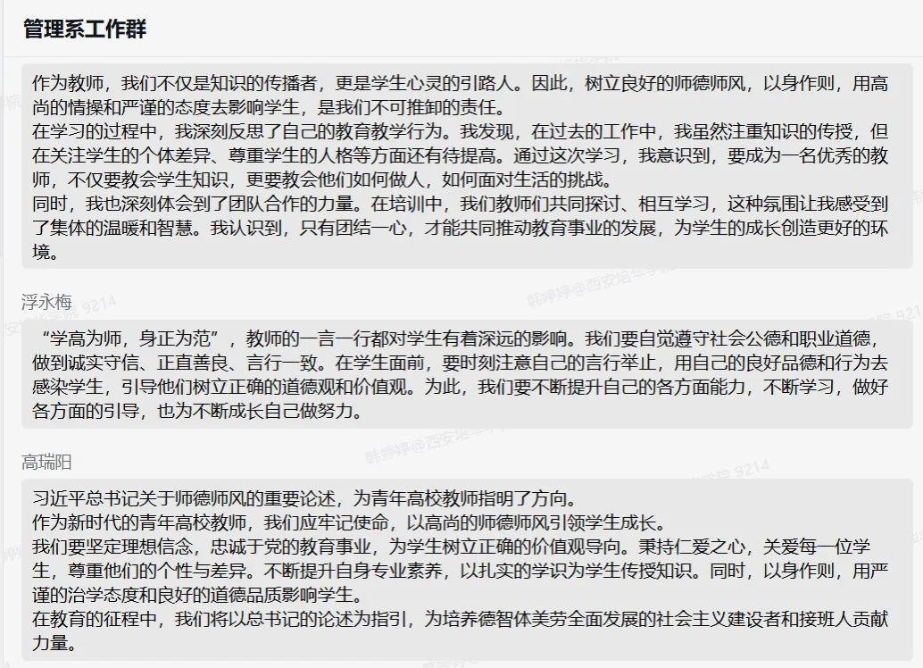 本次师德师风专题学习研讨活动结束后,每位教师无不深受启发,大家纷纷谈到了自己对师德师风建设的感慨,这些体会不仅是对今天会议的反思,更是对个人教育实践的深刻自省。无论是初入教坛的新教师,还是经验丰富的老教师,他们都以极大的热情投入到了这一过程中。他们通过工作微信这一便捷的平台,积极分享自己的所思所感,展现了教育工作者对于师德师风建设的重视与承诺。