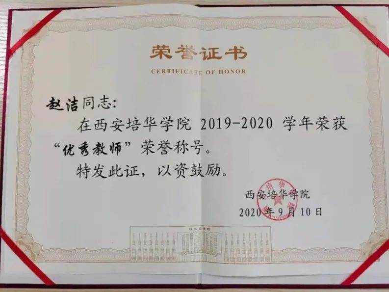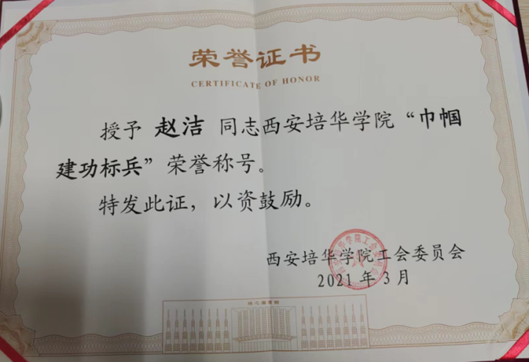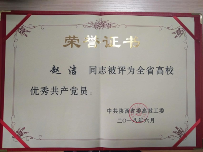 在党建工作方面,赵洁同志牢固树立学生党员 “四个意识”,坚定 “四个自信”,做到 “两个维护”。经过多年的不懈努力,赵洁同志取得了诸多荣誉,如 2018 年被评为陕西省优秀共产党员,2019 年、2020 年荣获校级优秀教师称号,2021 年被评为校级巾帼标兵,2024 年获得校级师德标兵称号,还多次被评为校级、院级优秀共产党员以及校级课程思政教学名师等。