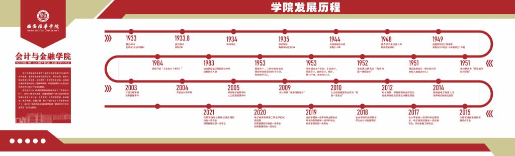学院早在1945年培华职校时期就开设了“高级会计科”,经过70多年的发展,现建设的有7个学士学位授予权的本科专业(会计学、财务管理、人力资源管理、市场营销、电子商务、金融工程、国际经济与贸易)和1个专科专业(大数据与会计),是2007年陕西民办高校最早获得“管理学学士学位授予权”的专业院系。
