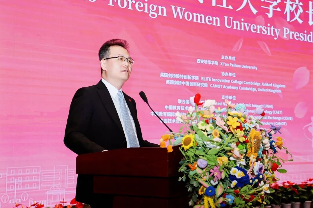 在论坛开幕式上,西安培华学院理事长姜波博士对与会嘉宾表示热烈欢迎与衷心感谢。他在致辞中回顾了西安培华学院自1928年建校以来,近百年致力于女性教育与职业发展的历程。他指出,学校创办之初即以“解放社会底层女性,推动其在经济与人格上实现独立”为使命,并于1984年恢复成立了改革开放后中国第一所女子大学——西安培华女子大学,成为中国现代女性职业教育的重要里程碑。在推动女性教育国际化的进程中,西安培华学院已与全球多个国家的多所高校建立了合作关系,旨在加强女性领导力、学术力与创新力的国际培养。他强调,女性是影响家庭、社会乃至世界和平与发展的重要力量,因此需要男女携手共同推进教育事业。在当今世界,高等教育工作者应汇聚智慧,积极推动教育改革与国际合作。