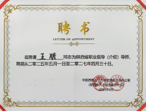 为全面推进公共就业服务体系建设,提升离校未就业高校毕业生及灵活就业人员等重点群体的求职能力,实现高质量充分就业,中国西安市人才市场管理委员会办公室(陕西省人才交流服务中心)发布了《关于征集选聘陕西省职业指导(介绍)导师通知》,经个人申报、学院推荐、招生与就业指导中心资格审查和省人才中心职业介绍指导工作部审核等环节,我院青年教师王朋成功入选陕西省职业指导(介绍)导师。