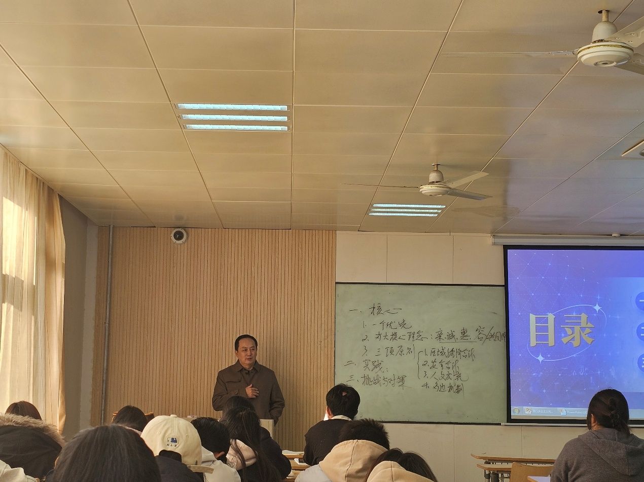 为深化形势与政策教育的思想引领力,11月26日,我校胡俊生常务副校长走进《形势与政策教育》课堂,以“中国的周边外交——亲诚惠容,共筑安全与发展共同体”为主题,为2025级大数据与会计专业01,02班的同学们带来了一堂兼具理论深度与现实温度的专题授课。