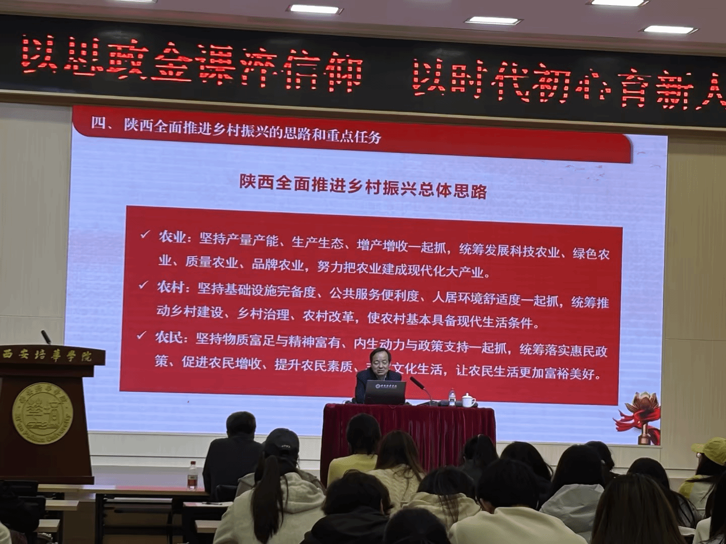 校党委书记刘锋主持总结时指出,贺军平同志的授课既有宏观视野又有微观洞察,既有政策高度又有泥土气息,是一堂生动的国情大课、民生大课、思想大课。他勉励广大师生以此次思政课为契机,进一步厚植“三农”情怀,把论文写在三秦大地上,在乡村振兴的火热实践中找准青春坐标、贡献智慧力量。