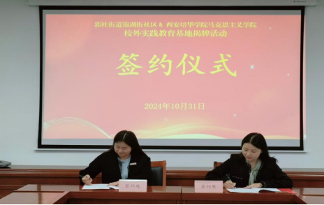 为提升人才培养质量,培养学生实践技能,进一步推动产学研一体化深度融合,打造实践育人广阔平台,西安培华学院马克思主义学院积极拓展校外实践基地。马克思主义学院副院长霍艾湘和思想道德与法治教研室主任沈永真带队前往西安市长安区郭杜街道锦湖街社区居民委员会,举行“西安培华学院马克思主义学院大学生校外实践基地”合作协议签约暨揭牌仪式。马克思主义学院副院长霍艾湘、思想道德与法治教研室主任沈永真、马克思主义学院教师郑禹晞、教师谢含云与锦湖街社区委员会书记张一曼、主任张铭珊、组长董彪、李梅、张莉均参加此次签约暨揭牌仪式。