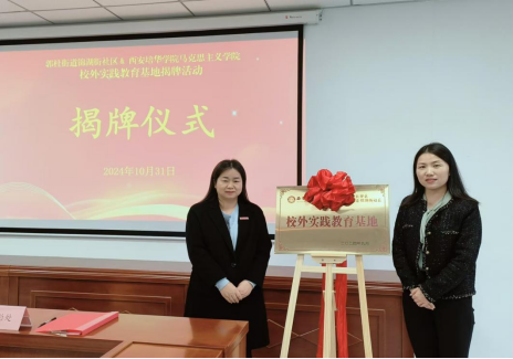 此次签约暨揭牌仪式分为四项。首先,张一曼书记向马克思主义学院建设发展、致力合作等工作表示感谢,并希望学院和社区委员会在前期良好合作的基础上,携手并进,共同围绕拟定的目标和肩负的使命,以实践基地建设为契机,精诚合作、优势互补、协同创新、共谋发展,不断创新合作机制体制,开辟高质量思政工作新路径。其次,霍艾湘副院长同张一曼书记举行校外实践基地揭牌活动签约仪式,正式签署合作协议后开展揭牌仪式。再次,双方就此次合作中的学科特点、团队建设、志愿服务、管理制度等多方面建设开展座谈会。最后,张一曼书记带领马克思主义学院团队参观锦湖街社区委员会的基础设施、工作环境、活动模式等。