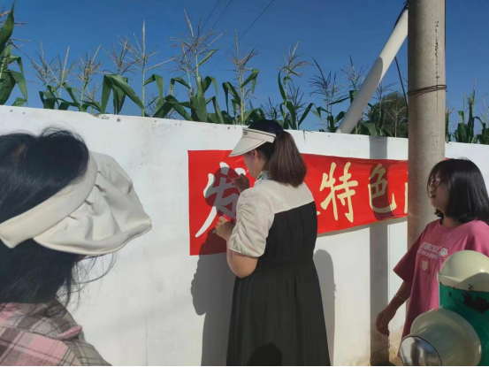 随后,团队成员又深入调研村庄,汲取创作灵感,与村民互动并邀请领导指导,最终在伊当湾村新址的墙面上确定了“发展特色产业 赋能乡村振兴”的主题。