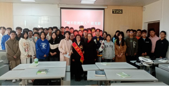 为了深入学习宣传贯彻党的二十大精神,进一步弘扬劳模精神,充分发挥新时代劳动模范的引领作用,2023年11月6日下午4点,马克思主义学院思想道德与法治教研室在3205教室组织开展“劳模进课堂”活动,此次活动邀请到劳动模范杜光彩同志,用真人真事现身说法开展情景式教学。