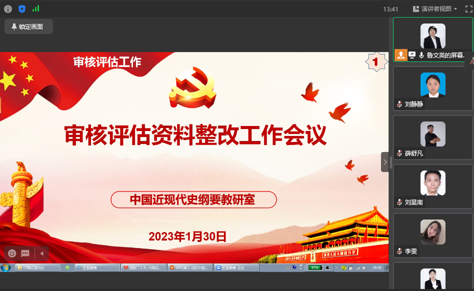 为了更好地落实部门领导的审核评估资料整改精神,《思想道德与法治》教研室、《中国近现代史纲要》教研室、《马克思主义原理》教研室、《毛泽东思想和中国特色社会主义理论体系概论》教研室、《习近平新时代中国特色社会主义思想概论》教研室、《形势与政策》教研室纷纷积极组织本教研室老师们及时召开会议,传达了院领导关于近期审核评估工作的四阶段部署:第一阶段:进一步整改审核评估资料。对近三年的过程性考核资料及试卷的整改,包括封面填写、补充考勤记录、过程性评分说明、作业检查、卷面分数、份数、装订顺序等相关内容。第二阶段:检查资料整改情况。进行整改资料审核检查,各教研室分成不同的检查小组,全面核查近三年过程性资料及试卷的整改情况,并汇集反馈,再进一步整改完善。第三阶段:补充完善审核评估教学文档。一方面编辑校对马院审核评估特色亮点支撑材料,然后汇集案例并编辑成册,包括校史融入思政课案例集和专业融入思政课案例集,反复校对后再印刷成册;另一方面补充教学管理的系列文档资料。第四阶段:以备赛提升教学质量。全员备战大练兵及各类教学比赛,充分做好审核评估期间听课准备工作。以听课、评课、检查等多种形式促进学院补齐短板,齐心协力,实现以评促建、以评促改。要求以上四阶段工作落实到教研室所有教师(包括新进教师),以实际扎实细致的各项任务落实,进一步开展迎接审核评估工作,形成人人有责、人人尽责的工作氛围,从而全面提高本科教学水平和人才培养质量。