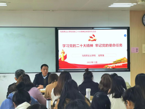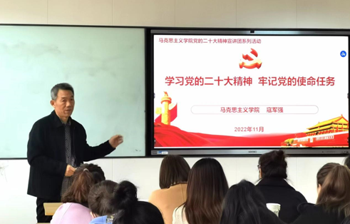 马克思主义学院积极发挥思想引领作用和辐射作用,适时开展党的二十大精神宣讲活动。一是参加了省教工委组织的党的二十大精神“马院院长宣讲团”活动,副院长寇军强在全校党委中心组作了宣讲。成立了马克思主义学院专家教授、思政课“标兵”、“能手”和青年骨干教师组成的党的二十大精神宣讲团,并以校党委的名义发文,面向全校各二级学院开展党的二十大精神宣讲,都在按计划进行中。二是联合校团委成立了学生讲师团。参加了“千马廿行”全国高校马克思主义学院青年学子联学联讲党的二十大精神系列活动,面向全校学生公开招募成员,组织宣讲团成员备课和培训,深入学习党的二十大报告、辅导读本、中央宣讲团报告等,现已完成讲稿的撰写和审定工作,各学生讲师正在积极筹备之中,有望培养、凝聚一批政治立场坚定、宣讲能力突出的讲师,共同打造出一批学习宣传贯彻党的二十大精神的示范“金课”。