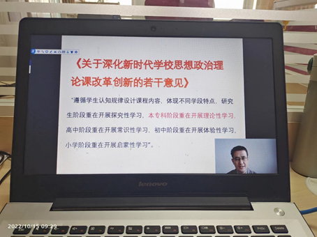 坚持第一时间推动党的二十大精神进课件,进课堂,进头脑。将二十大精神作为思政课重点教学内容,结合大学生成才成长实际针对讲解,切实把党的二十大精神学懂弄通、学深悟透,讲清楚、讲透彻、讲明白。党的二十大召开后,我院各教研室组织对思政课统编教材进行再研究,对教育部教工委提供的教学课件进行再学习,把党的二十大蕴含的重要思想、重要观点、重大战略、重大举措科学合理地融入《马克思主义基本原理》、《中国近现代史纲要》、《习近平新时代中国特色社会主义思想概论》、《形势与政策》等课程的各章节、各专题,做到党的二十大精神融入思政课全覆盖。教研室积极参加了11月26至11月27日北京高校中心组织的“二十大精神融入《毛泽东思想和中国特色社会主义理论体系概论》课教学研讨会”,开展了关于二十大精神融入课程教学的线上会议,讨论如何根据学生特质进行案例教学以提高学生点头率,讨论如何通过问题导向提高学生入脑率,引导青年学生进一步深化对科学真理的理解和认同。帮助大学生更好地了解党的二十大召开的政治意义、理论意义、历史意义和实践意义,了解马克思主义中国化时代化最新成果和中国共产党的历史使命,了解党中央各项重大战略部署,增强大学生对于中国特色社会主义的认同与自信。
