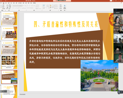 陈欢老师以讲述“矛盾的普遍性和特殊性关系”为核心融入了校史内容,让同学明白矛盾的普遍性和特殊性辩证关系的原理是马克思主义基本原理同民办高校办学、治学实际相结合的哲学基础。西安培华学院这所西部首家民办本科高校就是坚持把马克思主义基本原理同本校学情相结合,同西安这座城市和陕西民办教育实际相结合,在推进民办教育朝着办学理念先进、质量不断提高、设施齐全、学科完整的百年民校不断取得新的成绩。
