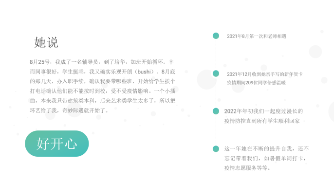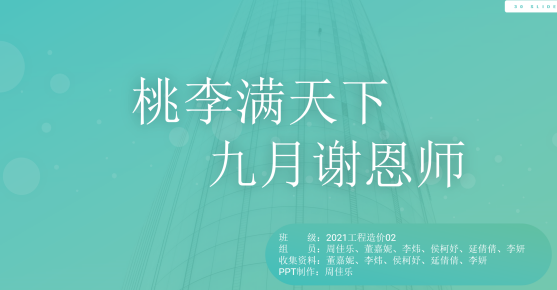 21级工程造价2班的小组同学和大家分享的建艺院学生心中最受尊敬的老师。是他们的良师益友、是心灵驿站、是学业导师,郝甜甜老师。小组同学回忆了去年刚入校到现在和老师的点点滴滴,并对老师送上了真诚的祝福。