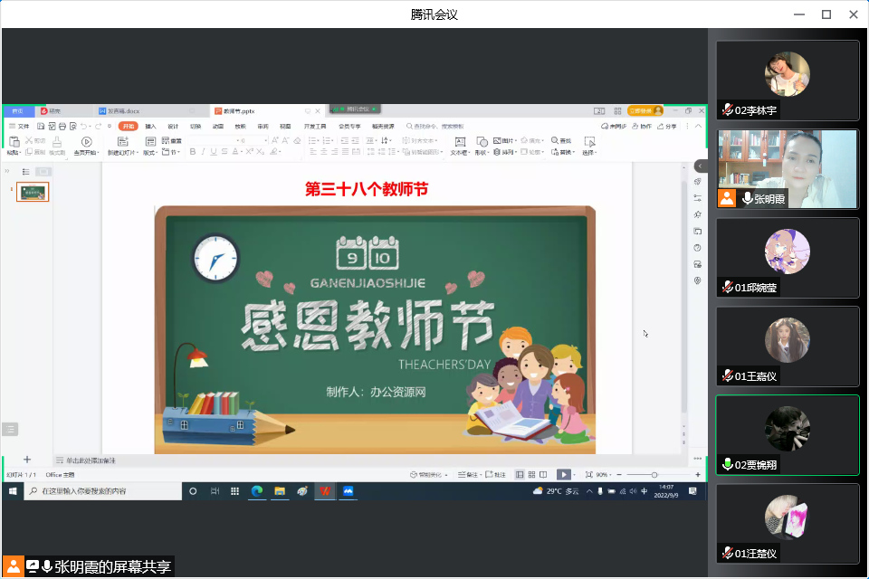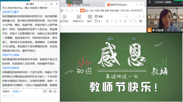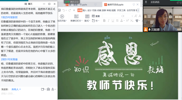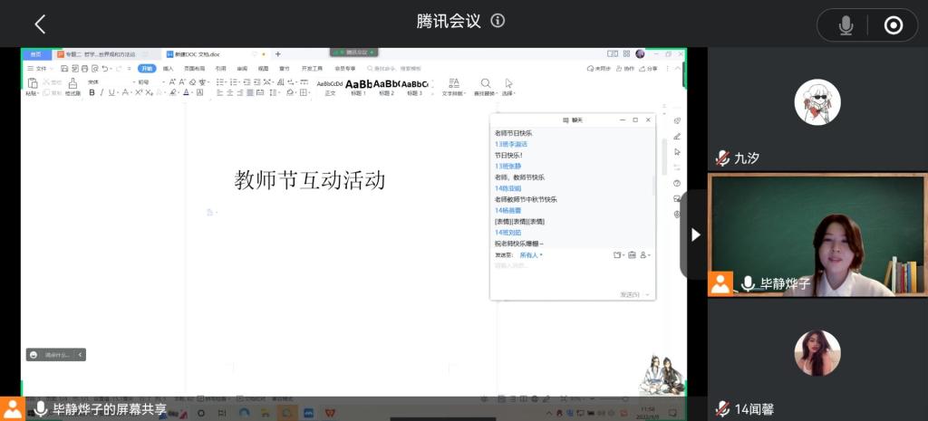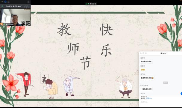 毕静烨子老师组织主题为“感谢师恩,共度佳节”的教师节互动活动。与学生在腾讯会议中进行交流互动,培养了学生尊敬师长和爱国的精神,让他们认识教师在社会主义现代化建设中做出的巨大贡献,感悟到教师无私奉献的高尚师德。