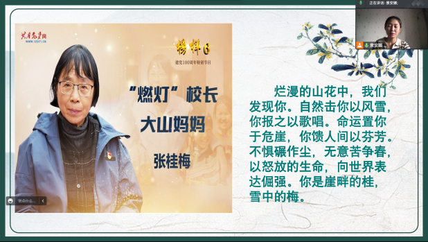 景安娜老师通过视频和图片的形式,为同学们讲述有关“燃灯校长”张桂梅、“布衣院士”卢永根的故事,在教师节这个特殊节日,让学生了解为祖国特别是为祖国教育事业所做出贡献的人,激励学生树立远大的理想,日后报效祖国,为社会做贡献。