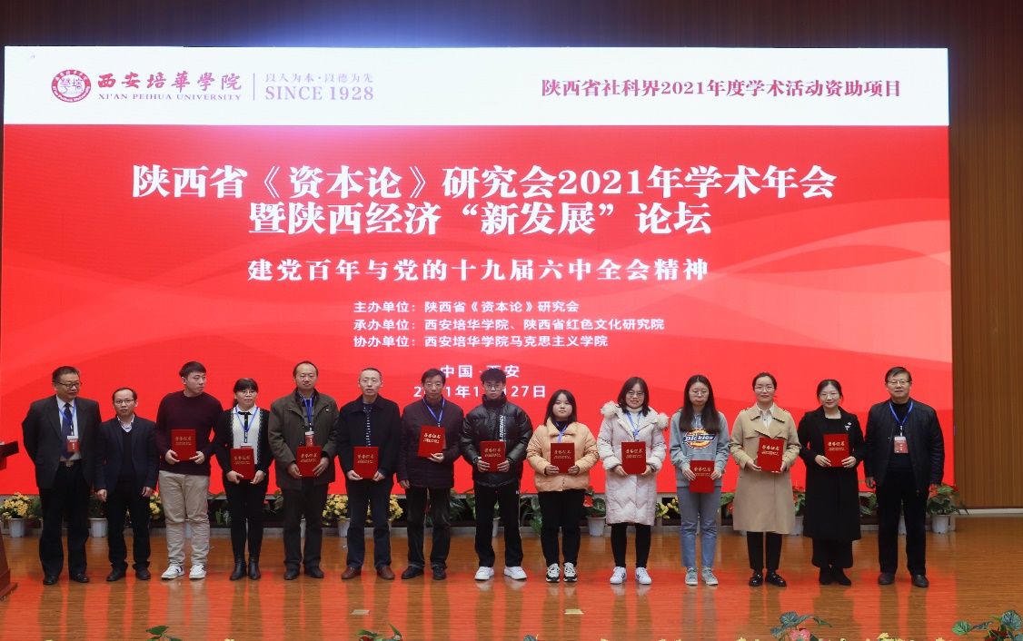 陕西省《资本论》研究会副会长胡红安教授主持了开幕式,陕西省社科联学会部副部长张利平、陕西省《资本论》研究会会长孔祥利等出席开幕式并致辞。秘书长姚宇宣读了获奖名单并主持颁奖仪式,我校马克思主义学院教师潘迎丽、胡红获得了二等奖,霍艾湘、赵艳获得了三等奖。