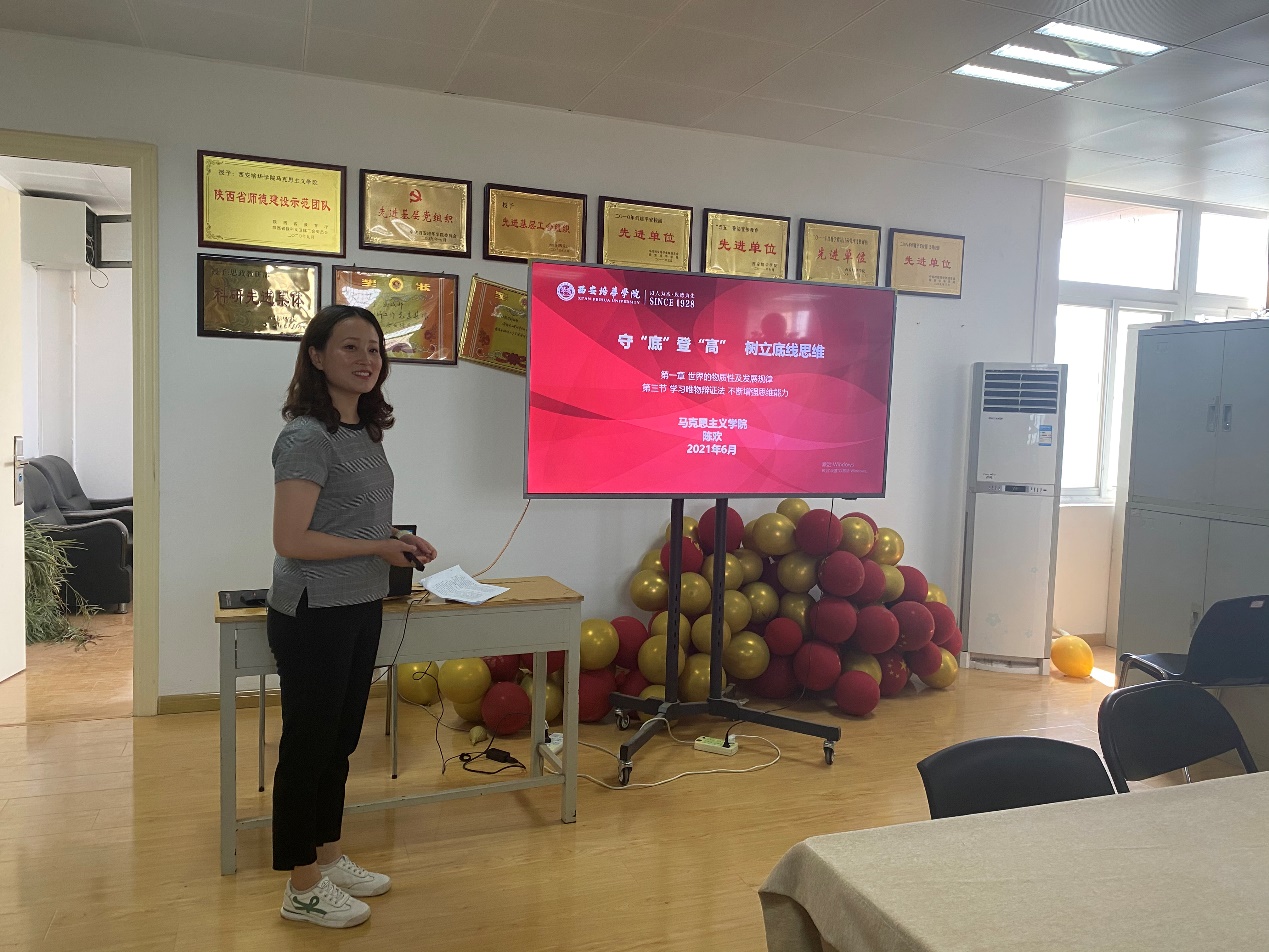 为提升我院青年教师教学能力,不断创新教学方式,真正做到习近平总书记在“3.18”讲话中讲到的“办好思想政治理论课关键在教师,关键在发挥教师的积极性、主动性、创造性。思政课教师,要给学生心灵埋下真善美的种子,引导学生扣好人生第一粒扣子。”2021611日上午在格物楼2501-A会议室举办了“西安培华学院第十一届青年教师教学竞赛初赛”,樊静、陈欢、马帆三位老师参加了初赛,副院长王袁媛副教授及各教研室主任担任评委。