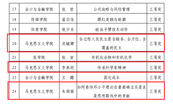 为推进信息技术与教育教学深度融合,提高一线教师信息化教学能力,促进教师的专业发展。马克思主义学院组织教师参加了学校第八届微课教学比赛,我院沈毓娜、李燕妮、朱娟丽老师获得微课教学比赛评比三等奖。马克思主义学院今后会继续鼓励教师积极参与教学比赛,希望各位获奖教师再接再厉,在今后的教学工作中起到榜样示范作用,也希望全体教师向获奖教师学习,不断强化专业技能,提升自身的业务素质,为我校教育教学质量提升做出更大贡献。