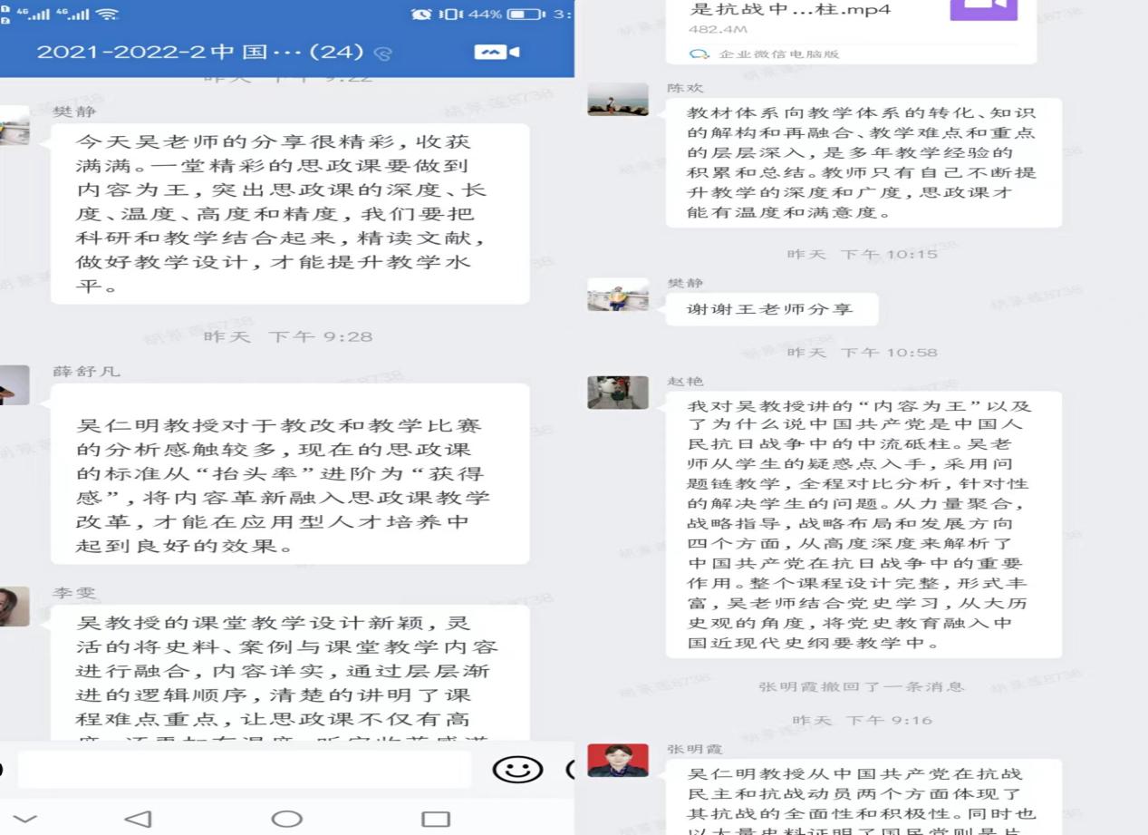 为进一步提升《中国近现代史刚要》课程的教学质量及教学水平,2022年4月15日晚19点西安培华学院马克思主义学院中国近现代史纲要教研室全体教师通过网络平台参加第37期中国近现代史纲要课名师讲堂暨教学观摩课的学习,同时教研室主任樊静老师根据此次线上观摩课的主题《为什么说中国共产党是中国人民抗日战争的中流砥柱》进行了云端集体备课,取得良好效果。