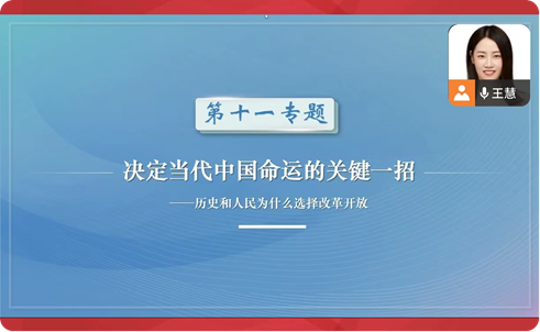 王慧老师在“第一节“历史性的伟大转折和改革开放的起步”、第二节“改革开放和社会主义现代化建设新局面”,围绕 历史性伟大转折和改革开放的起步、十一届三中全会、改革开放和现代化建设新局面的展开、在新的历史起点上推进中国特色社会主义这些内容介绍了自己的教学设计和教学理念。