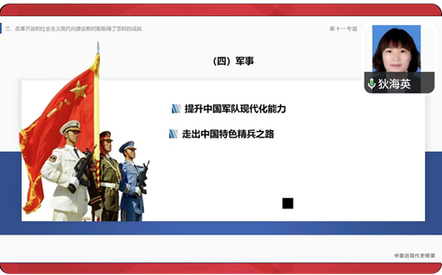 狄海英老师在第九章第三节“把中国特色社会主义事业全面推向21世纪”,重点讲述了社会主义市场经济体制改革目标和基本框架的建立、推进改革开放和现代化建设跨世纪发展,香港、澳门回归祖国与两岸交流扩大,以及推进党的建设新的伟大工程等内容。在第四节“在新的形势下坚持和发展中国特色社会主义”,详细讲解了进入21世纪,党中央全面建设小康社会的战略目标的确立以及不断推动我国经济社会的科学发展,奋力把中国特色社会主义推进到新的发展阶段等内容。