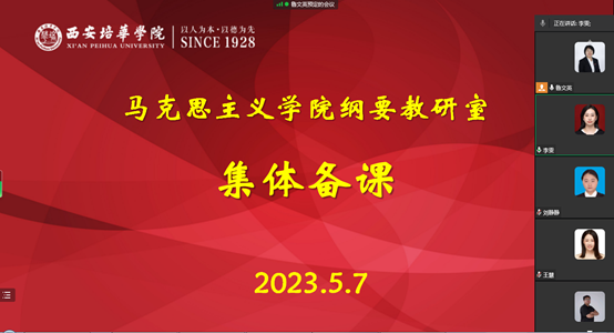 2023年5月7日,西安培华学院马克思主义学院中国近现代史纲要教研室针对审核评估期间教学内容开展线上集体备课活动。会议由纲要教研室主任鲁文英老师主持,教研室全体教师参加。
