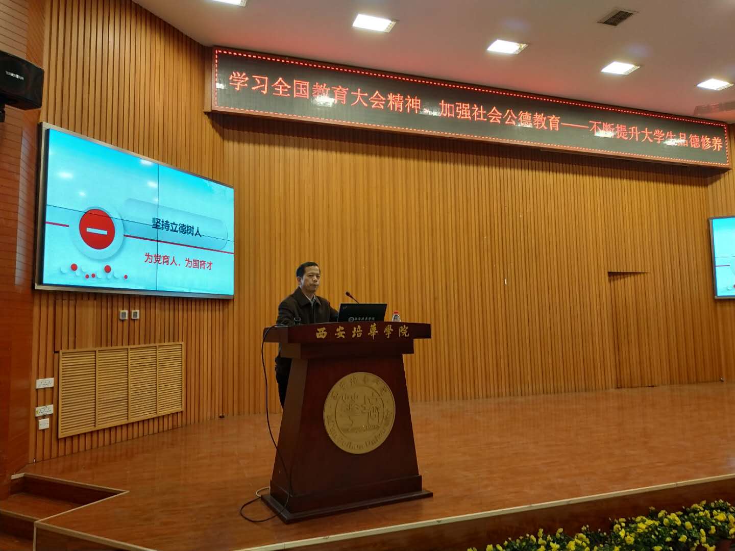 为了学习贯彻落实全国教育大会精神,推进习近平新时代中国特色社会主义思想进教材、进课堂、进学生头脑工作,12月5日下午,我校特邀“全国教育大会精神”专题示范巡讲教师、西安理工大学鲁宽民教授在明德楼四楼会议室作主题讲座,我校思政部主任史晓眉教授出席了此次活动,思政部副主任王袁媛主持会议。全体思政课教师以及学生一同聆听讲座。
