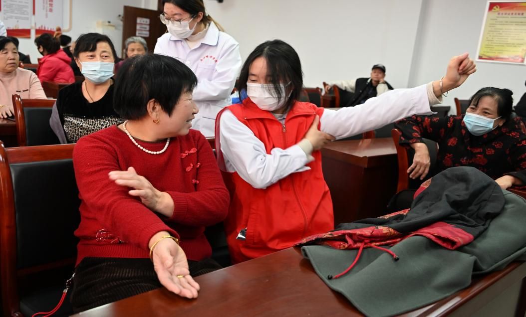 学生志愿者给社区老人科普健康知识