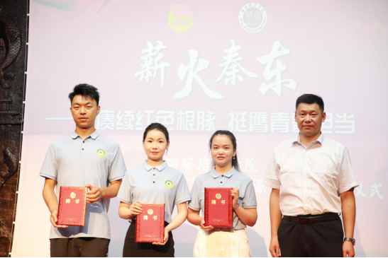西安培华学院党委副书记蔡亮为渭南市“东秦新青年”新时代理论宣讲团成员代表颁发了校外讲师聘书,搭建起校地协同育人、共同传承红色基因与非遗文化的新平台。