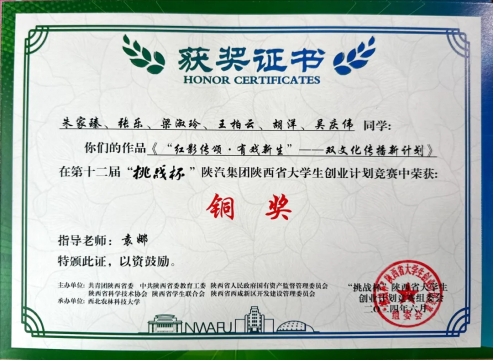 在第十二届挑战杯陕汽集团陕西省大学生创业大赛中,由西安培华学院马克思主义学院袁娜老师指导的文化创意赛道项目“红影传颂·有戏新生”双文化传播新计划,凭借其独特的创意和扎实的实践在众多队伍中脱颖而出进入决赛,成功获得了陕西省省赛铜奖的好成绩。