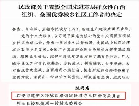 西安市莲湖区环西街道社工站在社区治理方面具有深厚的历史传统和先进的工作经验,先后获得陕西省妇女儿童工作示范社区、陕西省计划生育工作先进社区,西安市社区建设示范社区、西安市创建国家卫生城市先进单位、西安市退休人员社会化管理服务工作示范社区、西安市促进就业再就业工作先进社区、西安市低保工作先进社区、西安市先进老年协会,莲湖区“师范基层党组织”、莲湖区创建省级计划生育优质服务区先进集体、文明社区、残疾人工作先进社区、创建文明社区先进集体、治安综合治理“安全社区”,2022年荣获“全国先进基层群众性自治组织”荣誉表彰。