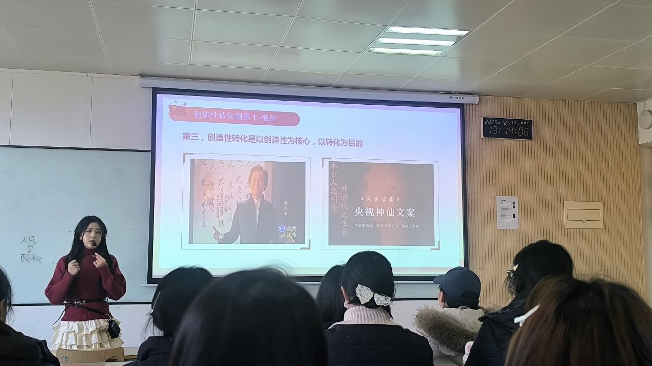 为帮助师生更好理解理论内涵,毕静烨子老师结合了传统文化活化的鲜活案例,从《国家宝藏》等节目对文物的创新演绎,到生活中传统技艺的现代化应用,生动展现了“两创”理念在当下的实践成果,也点明了青年群体在文化传承中应当担负的责任——既要做中华优秀传统文化的学习者、传承者,也要做转化与发展的参与者、创新者。