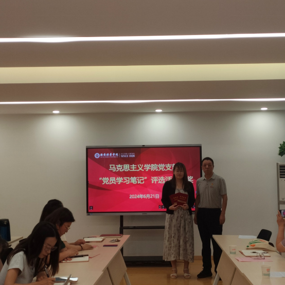 会上,还举行了马克思主义学院党支部“党员学习笔记”评选活动颁奖仪式。从5月30日至6月13日成功举办了此次“党员学习笔记”评选活动,经过各教研室党小组的初步评选,共有19本优秀笔记脱颖而出。经过学院复评,最终评选出6本党员学习笔记荣获奖项。此次评选活动旨在促进全体党员学习的积极性和自觉性,提高党员的政治理论水平,并通过评选优秀学习笔记的方式,激励党员们更加认真地对待学习,形成浓厚的学习氛围,深入贯彻落实党的理论学习要求,提升我院党员的理论水平和党性修养,共同推动学院党建工作再上新台阶。