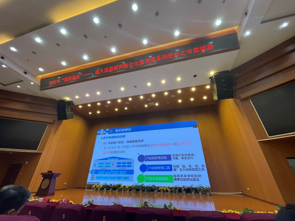 10月27日下午,中共西安培华学院委员会主办、党委宣传部信息中心承办了2021年“国是论坛”——第八届国家网络安全宣传周系列活动之专家讲座。本次讲座邀请了空军军医大学网络中心主任高东怀教授在维之图书馆报告厅举行了《以智慧教学环境为抓手 推进智慧校园全面发展》讲座。马克思主义学院的教师代表参加了会议。
