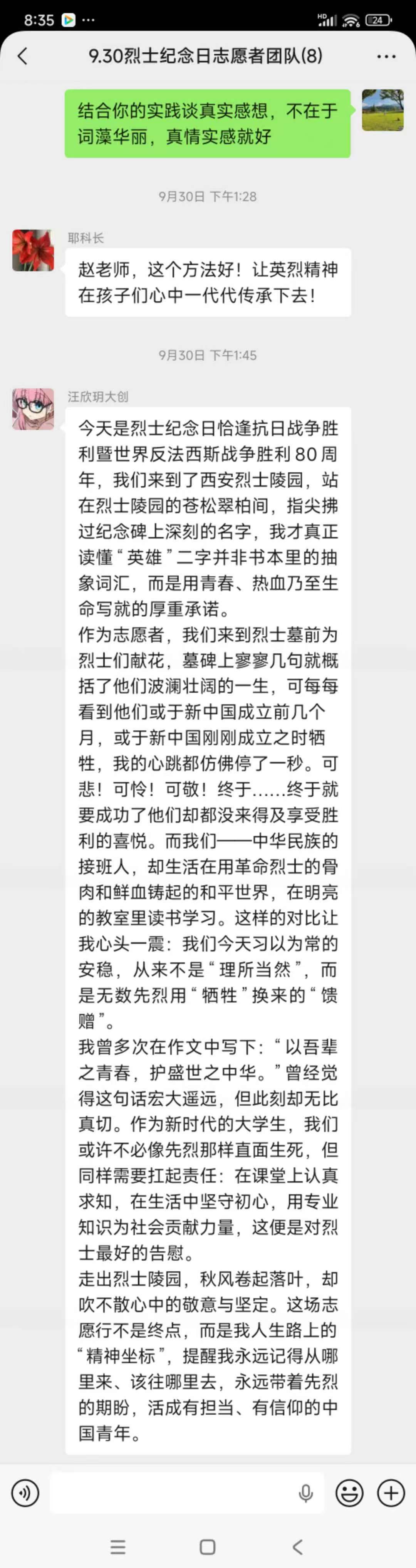 9月30日第九个烈士纪念日,马克思主义学院赵艳老师带领6名学生志愿者前往西安烈士陵园开展志愿服务活动并在活动间隙给同学们开展现场实践教学。