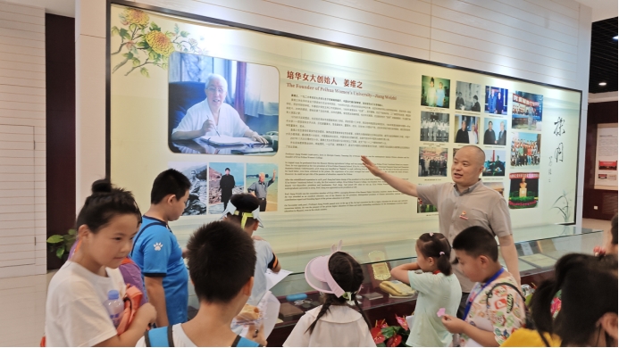 在姜维之先生雕像和维之图书馆内,魏老师向孩子们提问:“我们为什么能够战胜日本侵略者?”“因为团结!”“因为勇敢!”孩子们争先恐后地回答。魏老师一一肯定大家的答案,并总结道:“爱党爱国、众志成城,坚定信仰、求知报国,这些都是抗战胜利的重要原因,也是我们推进中国式现代化的力量之源。”