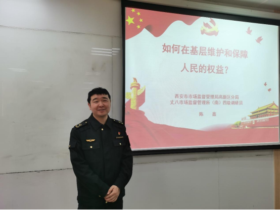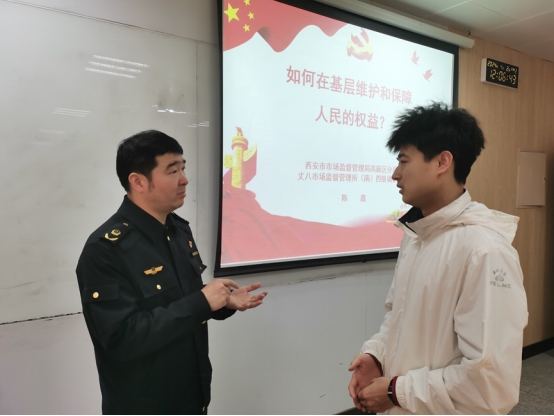 4月2日,我校马克思主义学院特地邀请了西安市市场监督管理局调研员陈鑫,在育英楼3319教室,共同举办了一场主题为“如何在基层维护和保障人民的权益?”的讲座。此次活动旨在加强高校师生对市场监管工作的了解,同时深化对人民权益维护的认识。