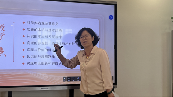 在说课示范环节,袁秦英老师围绕教学内容、教学重难点等方面向大家梳理了第二章的教学要点。她强调,《马克思主义基本原理》课教学过程应把握“逻辑性”这一关键点,从整体上把握马克思主义基本原理这门课,从而把马克思主义基本原理讲懂说通。紧接着,老师们围绕马克思主义基本原理第二章的教学内容展开了深入的交流与讨论。